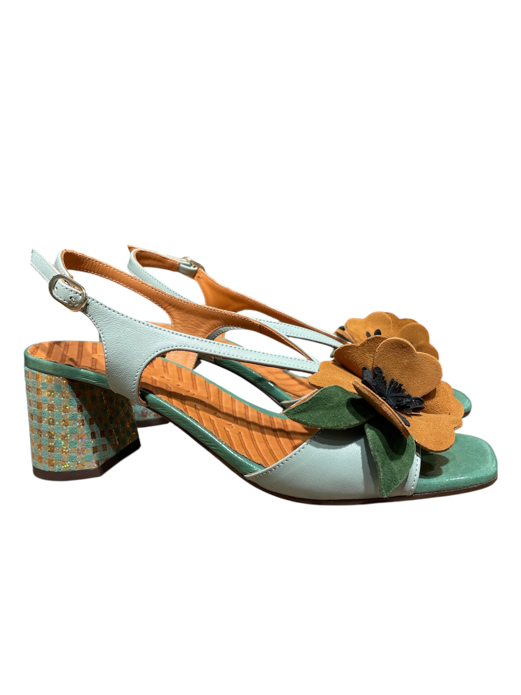 Sandali Chie Mihara in pelle color menta con punta aperta e cinturino regolabile alla caviglia, impreziositi da un maxi fiore applicato in pelle color cuoio con dettagli verdi e neri. Il tacco medio largo presenta un motivo a scacchi colorati che dona un tocco originale e distintivo al design.