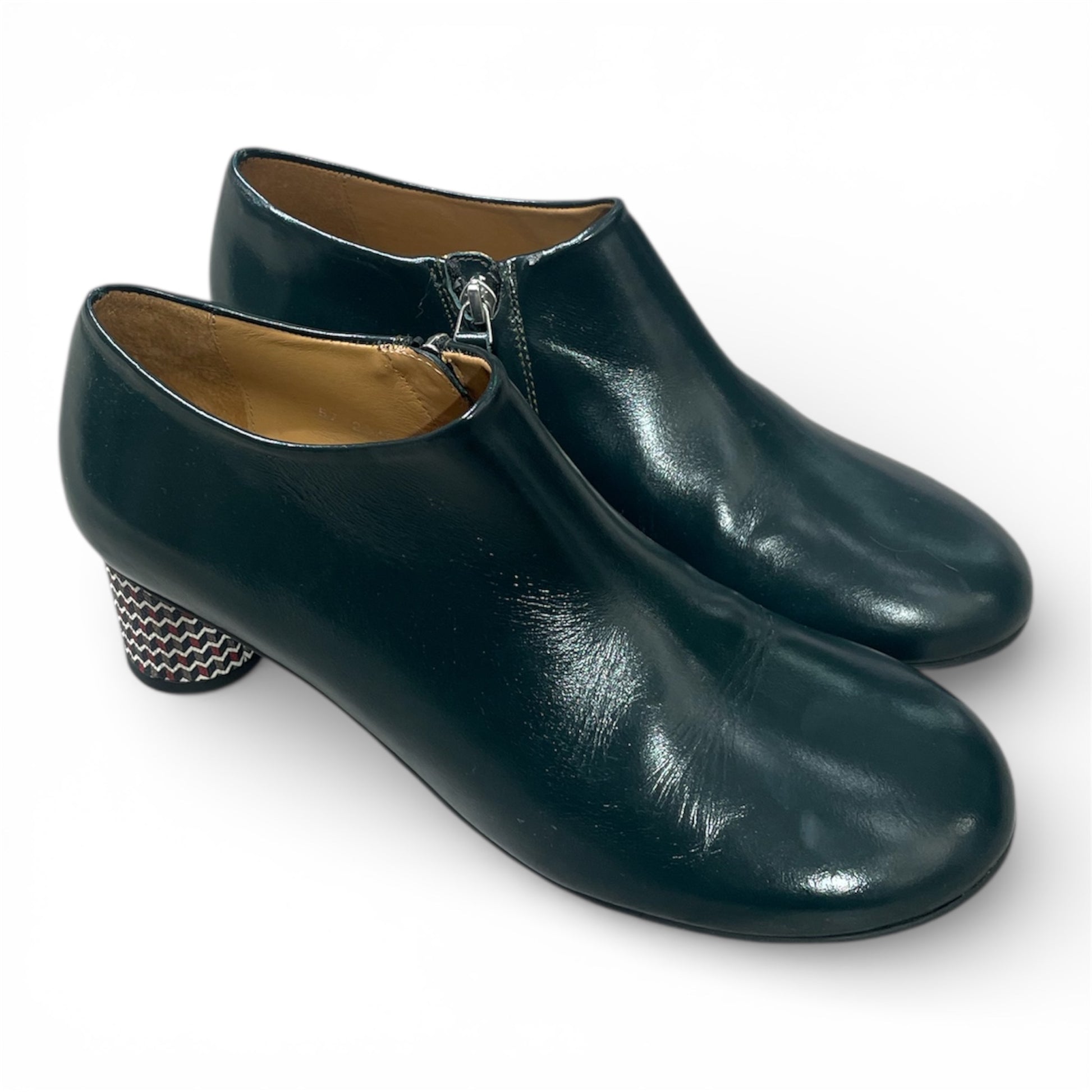 Tronchetti  eleganti in pelle verde, con una chiusura a cerniera sul lato interno. Il tacco, di altezza 5cm , ha un design particolare, con decorazione a mosaico.