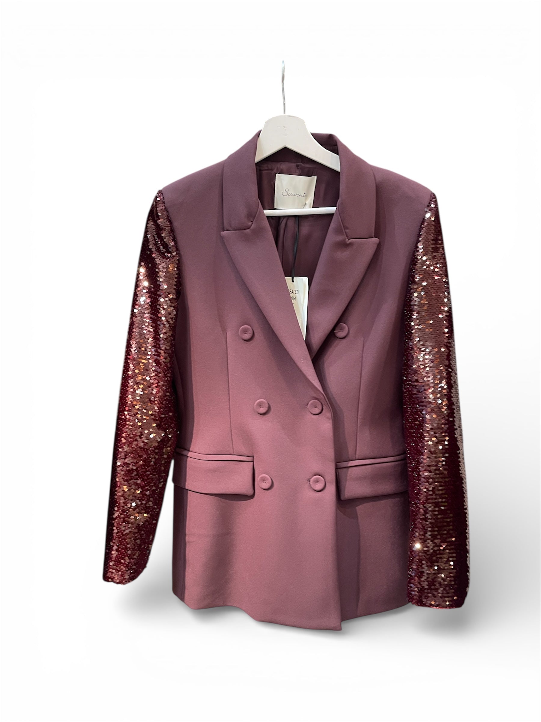 Blazer elegante Souvenir, in color vino. Le maniche in paillettes luminose aggiungono un tocco glamour, rendendolo perfetto per occasioni serali o outfit sofisticati.
