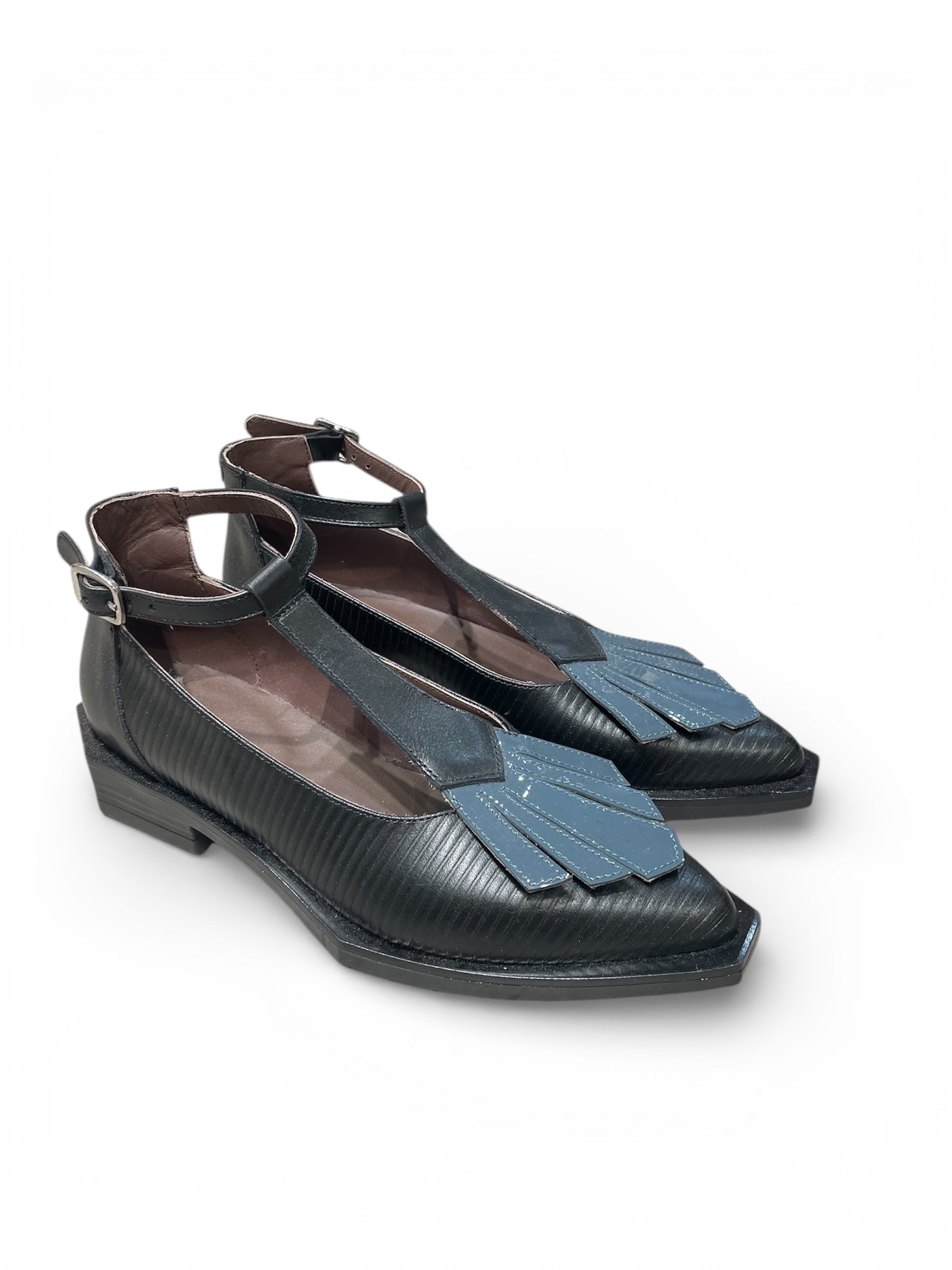 Le Bohémien ballerine frangia sono nere con un design elegante e moderno. Hanno una punta squadrata e delle frange color anice  nella parte superiore, Inoltre, presentano una cinghia alla caviglia con una fibbia per un fit regolabile.