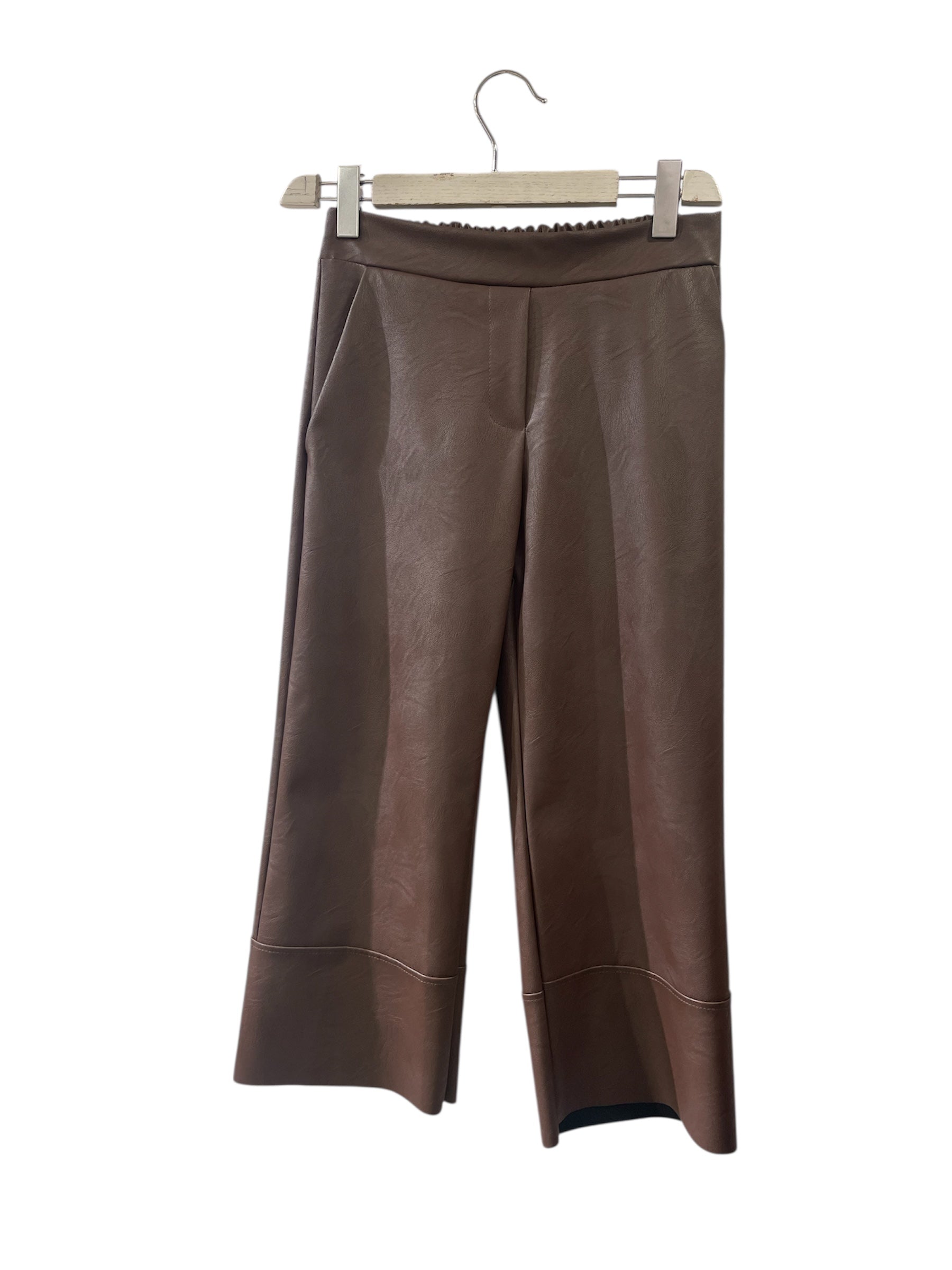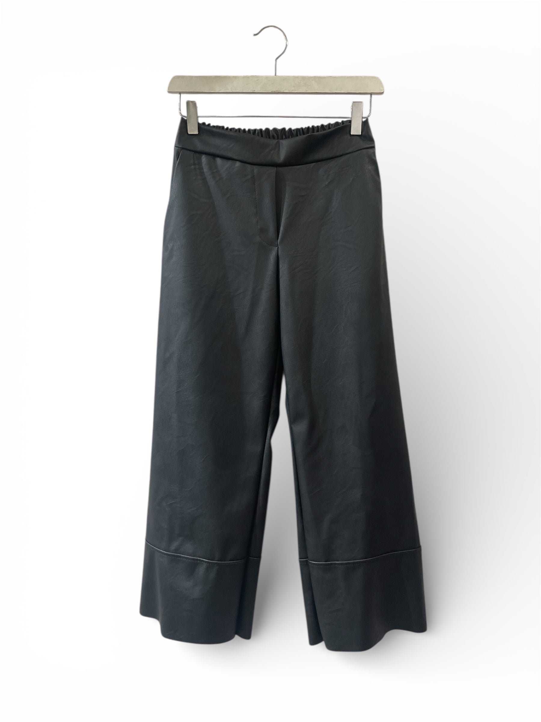 Pantaloni ecopelle trombetta, in color nero e cioccolato. Linea pulita ed elegante, ideali per look moderni e versatili.