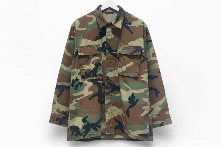 Camicia Philia Loft in fantasia camouflage con tasche frontali e chiusura a bottoni. Sul retro maxi patch di Minnie Mouse con fiocco rosso a pois, per un tocco originale e ironico.