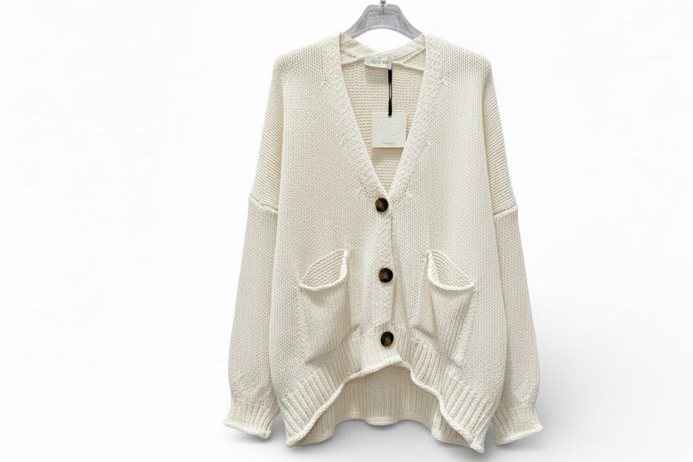 Cardigan modello over con vestibilità morbida, scollo a V profondo e chiusura frontale con bottoni. Presenta maniche lunghe leggermente ampie, tasche applicate sul davanti e fondo con lavorazione a coste e taglio leggermente asimmetrico.